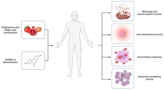 Urolithin A was demonstrated to be safe, bioavailable, and well-tolerated in the in vivo animal models but also in human experiments. The variety of potential health benefits tended to be related to the activation of mitophagy, improvement of mitochondrial homeostasis, and reduction of inflammation [75]. However, research is focused mostly on tissue- or disease-specific targets; thus, the potential mechanisms and pathways may differ [76]. Moreover, there is still a lack of clinical trials that currently deal with promoting healthy ageing via nutritional intervention [11,56].