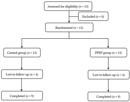 Because the expected dropout rate was 10%, nine participants per supplementation were recruited, i.e., nine non-diabetic insulin-resistant volunteers with obesity who were allocated to the control and PPEP group, leading to a total of 18 subjects. Inter-group and intra-group analyses were performed using Prism (version 9.4.0). The one-way ANOVA was performed using R Studio (version 2022.02.0). A statistically significant value of p < 0.05 was used.