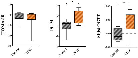 Intergroup comparison of variations in insulin sensitivity indexes between the control and PPEP groups. The variations were calculated using the following formula: (3 months post-supplementation − baseline). Comparison between groups was performed using a paired t-test for normally distributed data and a Wilcoxon test for non-normally distributed data; p < 0.05 indicates a significant difference. The difference between groups is indicated by *: p < 0.05. HOMA-IR, homeostasis model assessment of insulin resistance; ISI-M, insulin sensitivity Matsuda index; SI(is)-OGTT, simple index assessing insulin sensitivity.