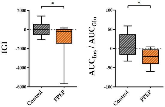 Regarding insulin secretion, the variations between baseline and 3 months post-supplementation in the IGI and AUCIns/AUCGlu ratio were lower in the PPEP group than in the control group (−1007 ± 1875 vs. 54.15 ± 778.3, p = 0.04 and −22.4 ± 21.4 vs. 9.3 ± 30.8, p = 0.03, respectively; Figure 3).