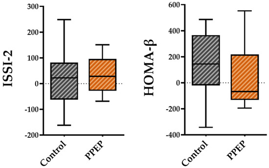 Intergroup comparison of variations in pancreatic beta cell function indexes between the control and PPEP groups. The variations were calculated using the following formula: (3 months post-supplementation − baseline). Comparison between groups was performed using a paired t-test for normally distributed data and a Wilcoxon test for non-normally distributed data. ISSI-2, insulin secretion-sensitivity index-2; HOMA-β, homeostasis model assessment of beta cell function.