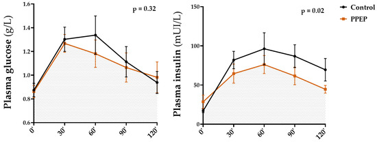 Values at 3 months post-supplementation showed a significantly lower AUC of insulinemia during OGTT in the PPEP group compared with the control group (p = 0.02; Figure 4). Moreover, the proportion of insulin-resistant volunteers, based on the HOMA-IR index, was significantly reduced in the PPEP group (99.9% vs. 66.6%, p = 0.04; Table 2).