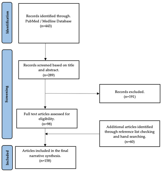 A detailed, nonsystematic electronic search was performed to find evidence of the effects of COVID-19 on male fertility and to investigate the possible role of antioxidants in counteracting COVID-19 oxidative-stress-induced damage in male reproduction. The search was performed in the Medline database using the PubMed search engine. The search terms used were (COVID-19 OR SARS-CoV-2) AND (semen OR sperm OR semen parameters OR hormones OR sex hormones OR testosterone OR gonadotropins OR testis OR testis OR autopsies OR oxidative stress OR reactive oxygen species OR antioxidants OR vaccines) AND (male fertility OR male infertility OR male reproductive system OR hypogonadism). The first search from inception to 24 May 2023, found 443 articles. Based on the title and abstract, 289 articles were deemed appropriate for our search topic. Of these, 98 articles were included in the final text. The references of the eligible articles were manually searched for additional articles relevant to this work’s overall goal. A total of 152 articles were considered to prepare this paper (Figure 1).