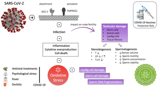 Increased inflammation was noted in both the testes and epididymis. According to the same studies, men who died of COVID-19 had increased angiotensin-converting enzyme 2 (ACE2) expression in their Leydig cells [13]. Seminiferous tubules from deceased COVID-19 patients show an increase in apoptotic cells, suggesting that spermatogenesis was disrupted by SARS-CoV-2. Viral infection is also known to affect seminal fluid quality and endocrine dyshomeostasis. Ma et al. showed that the ratio of testosterone (T) to luteinizing hormone (LH) was lower, and circulating levels of LH were higher in COVID-19 patients than in the general population [14]. This suggests that the patients had abnormal Leydig cell activity. Koç and Keserolu [15] reported that testosterone levels are lower after infection, a finding that Cinislioglu et al. [16] related to disease severity. The results regarding sperm quality are somewhat contradictory. Sperm quantity, total and progressive sperm motility, and sperm morphology are significantly affected by COVID-19 infection [15,17,18]. It is important to note that impairment of antioxidant activity and induction of oxidative stress (OS) may be responsible for the overall mode of action of respiratory viral infections (a cascade of systemic pathophysiological events, including inflammation, cytokine generation, host cell death, and more) [19]. The positive results of antioxidant therapies warrant further exploration of the possibility of antioxidant treatment of COVID-19 to improve not only COVID-19 but also the disease-related disorders of male reproduction. This review aims to identify the effect of COVID-19 on testicular endocrine and exocrine function, study the possible interplay of COVID-19-induced oxidative stress with male fertility, and explore any potential role of antioxidants in the management of COVID-19.