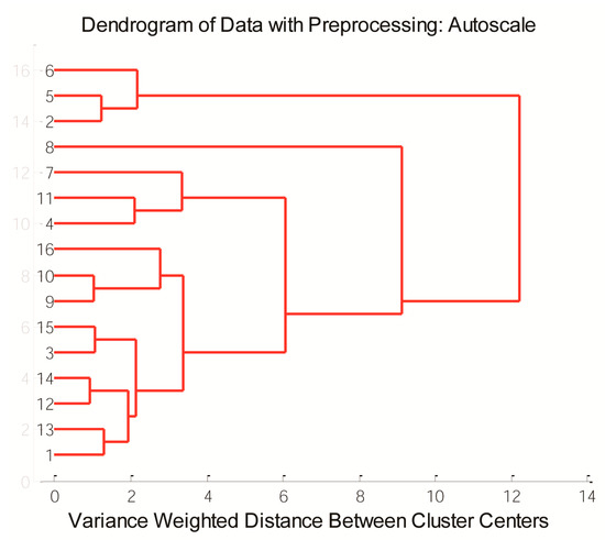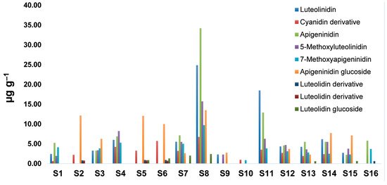 At a 10% similarity level, there were two clusters that differed due to variation between the phenolic content: the first cluster consisted of samples S2, S5, and S6 grouped together, while another cluster contained other samples (Figure 4). At a lower similarity level, samples S4, S7, and S11 formed one cluster, S2, S5, and S6 samples formed a second cluster, S1, S3, S9, S10, and S12–S16 formed a third cluster, and samples S9, S10, and S16 were grouped together. Due to the highest amount of luteolinidin, apigeninidin, 5-methoxyluteolinidin, and apigeninidin glucoside, sample S8 was separated from other samples, which is in agreement with PCA analysis.