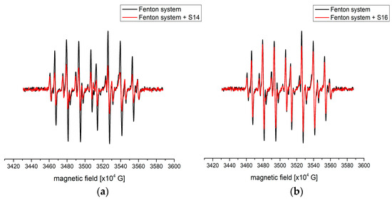 Based on the data in Table 1, it can be concluded that a wide range of reduction percentages of HO• was obtained, between 15.8 (sample S16) and 56.6% (sample S14). The amount of carbon-centered radical species was higher in the case of sample S14 than in sample S16, proving that a higher amount of organic compounds was present in the former. A certain discrepancy between this test and previously discussed radical scavenging activities is present. This can be attributed to the size and steric hindrance of DPPH and ABTS, which limit the possibility of scavengers reducing the present radical. In the case of S14, it was observed that the amount of measured compounds with antioxidant properties was among the highest, which was probably the reason for the calculated percentage.