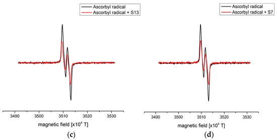 On the other hand, the reduction percentages of ascorbyl radicals were in a much narrower range, between 22.0 (sample S7) and 42.6% (sample S13) (Figure 2c,d, Table 1). The presence of other radical species was not observed due to the lower reactivity of the analyzed system [51]. The phenolic profile of both samples includes luteolinidin, cyaniding, apigeninidin, 5-methoxyluteolinidin, 7-methoxyapigeninidin, and apigeninidin glucoside, which are known as good radical scavengers, but it can be assumed that in the case of sample S13, other compounds were also responsible for the scavenging activity.