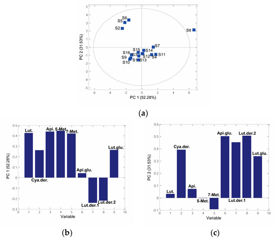 In the current study, PCA was performed on the data set of phenolic content in sorghum grains. Three principal components (PCs) described 88.99% of the total data variability. PC1 described 52.28% of the variability, while PC2 and PC3 described 31.53% and 5.18%, respectively. Sample S8 was outside the Hotelling T2 95% probability ellipse and was therefore recognized as an outlier. In contrast to other samples, sample S8 had the highest amount of luteolinidin, apigeninidin, 5-methoxyluteolinidin, and apigeninidin glucoside. Based on PC2, there were two groups of sorghum genotypes: samples S2, S5, and S6 formed one group of samples on the left side of the PCs score plot, while other samples formed a second cluster of samples (Figure 3a). Samples S2, S5, and S6 contained a higher amount of apigeninidin glucoside, and a minor amount of luteolidin derivatives 1 and 2, as well as cyanidin derivative.