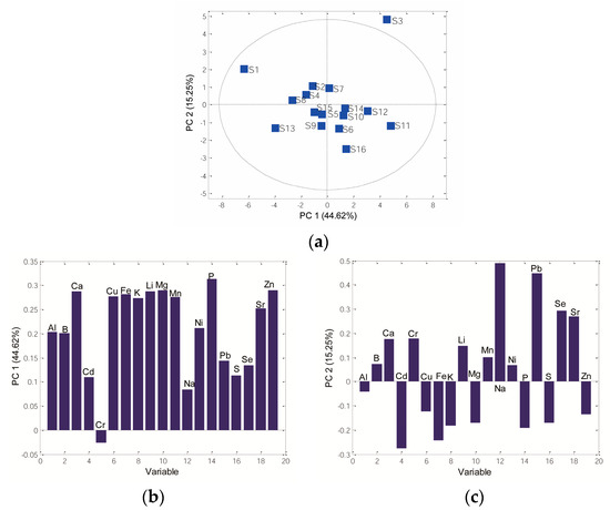 PCA was applied to show the chemical patterns between the analyzed sorghum grains based on elemental profiles. After PCA, three novel PCs described 70.37% of the total data variance. PC1, PC2, and PC3 accounted for 44.62%, 15.25%, and 10.50% of the total variance. One sample, S3, was inside the Hotelling T2 ellipse, suggesting that S3 was recognized as an outlier. The 2D PCs showed a separation between analysed genotypes, with two groups of samples (Figure 5a): PC1 clearly separated samples S6, S10, S11, S12, and S16 from other samples no. S2, S4, S5, S7, S8, S9, S13, and S15, while sample S1 was separated from all investigated samples. Further, according to PC2, there are two groups of samples: samples S1, S2, S4, S7, and S8 formed one cluster, while other samples were positioned on the downside of the PC score plot.