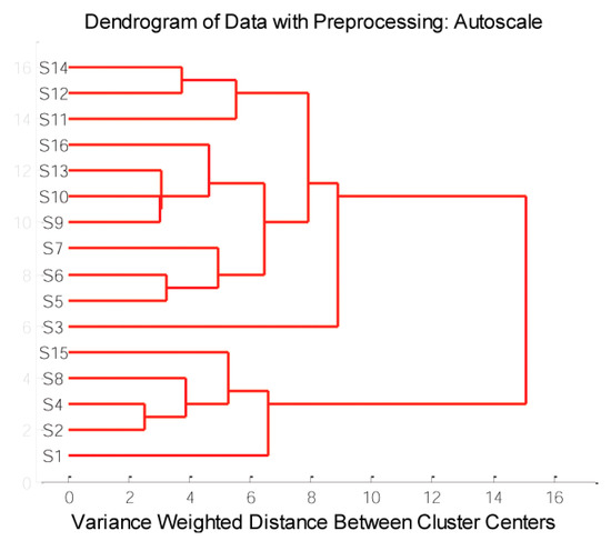The HCA considers all the data variability and shows the similarity/dissimilarity among sorghum grains based on element concentration. HCA applied to the 16 samples revealed two clusters at 10 variance-weighted distance units: the first cluster was composed of S1, S2, S4, S8, and S15, while the second cluster was entirely composed of other samples (Figure 6). The HCA results agreed with those of PCA, in which S1, S2, S4, and S8 formed one group of samples.
