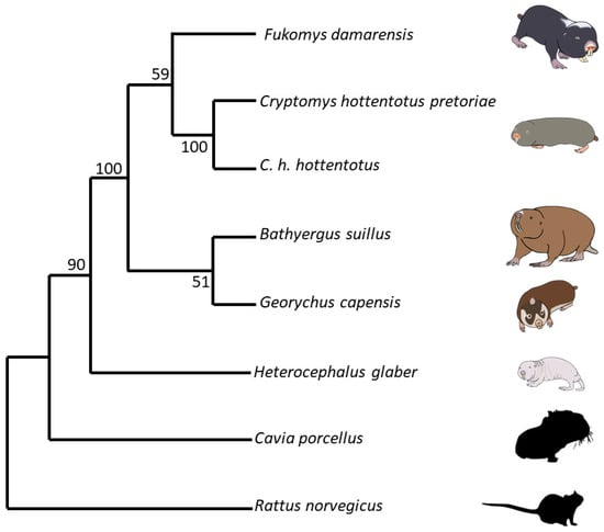 Cytochrome b gene sequence fasta files for each species were obtained from the existing GenBank data [132]. This involved the cytochrome b sequence for mole-rats, namely, Heterocephalus glaber Accession No. MT8453841 [133], Fukomys damarensis Accession No. AF012223.1 [134], Cryptomys hottentotus pretoriae Accession No. AF012236.1 [134], Cryptomys hottentotus hottentotus Accession No. MH186559.1 [135], Bathyergus suillus Accession No. KJ866687.1 [136], and Georychus capensis Accession No. U18837.1 [137]. We also obtained the cytochrome b sequences for the two outgroups, namely, Rattus norvegicus Accession No. KT024821.1 [138] and the Guinea pig Cavia porcellus Accession No. AY382793.1 [139]. Aligning was carried out using Mesquite version 2.75 [140]. Tree building was carried out using the Molecular Evolutionary Genetic Analysis Version 11 (MEGA11) program [141]. Mesquite files were converted to mega files and, using the “Phylogeny” menu, neighbour-joining trees were created using the Neighbour-Joining method [142]. The percentage of replicate trees in which the associated taxa clustered together in the bootstrap test (1000 replicates) are shown next to the branches [143]. The evolutionary history was inferred using the evolutionary distances computed using the Maximum Composite Likelihood method [144] and are in the units of the number of base substitutions per site. This analysis involved eight nucleotide sequences. The best DNA substitution model for each set of sequence alignments was found using the “Models” menu, and this was used to create the trees. All ambiguous positions were removed for each sequence pair (pairwise deletion option). There were a total of 1201 positions in the final dataset. Evolutionary analyses were conducted in MEGA11 [145]. The optimal tree is shown and drawn to scale, with the branch lengths the same units as those of evolutionary distances used to infer the phylogenetic tree (Figure 1).