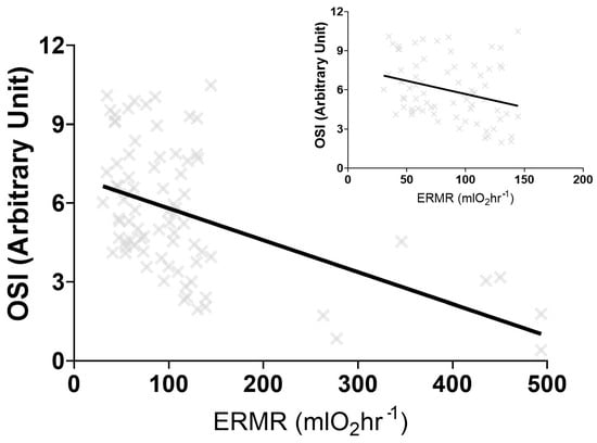 The significant negative linear regression output between the oxidative stress index (OSI) and the estimated resting metabolic rate (ERMR) for five different captive mole-rat species and two subspecies, the naked mole-rat, Heterocephalus glaber, the Damaraland mole-rat, Fukomys damarensis, the highveld mole-rat, Cryptomys hottentotus pretoriae, the common mole-rat, C. h. hottentotus, the Cape mole-rat, Georychus capensis and the Cape Dune mole-rat, Bathyergus suillus. The negative relationship remains significant when B. suillus is removed (figure insert).