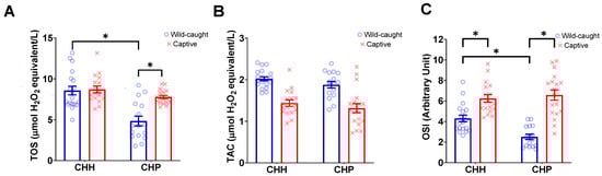 The oxidative stress markers of TOS, TAC, and OSI were measured in captive and wild CHH, as well as captive CHP, captive GC, and BS (Table 1).