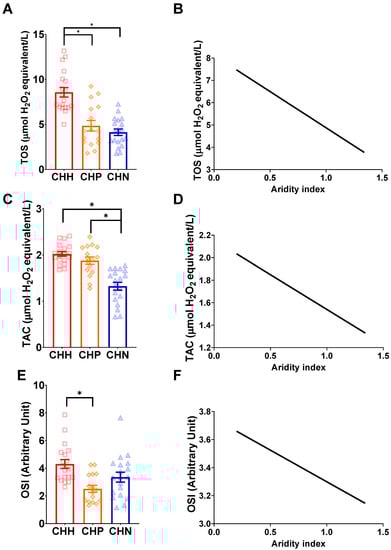 The relationship between oxidative markers and the aridity index between three different wild-caught mole-rats, namely common mole-rats, Cryptomys hottentotus hottentotus (CHH—red with squares), highveld mole-rats, C. h. pretoriae (CHP—orange with diamonds) and the Natal mole-rat, C. h. natalensis (CHN—blue with triangles) for (A,B) total oxidant status (TOS), (C,D) total antioxidant activity (TAC), and (E,F) oxidative stress index (OSI). Bars represent the mean ± s.e.m. An asterisk (*) indicates significance (p ≤ 0.05).