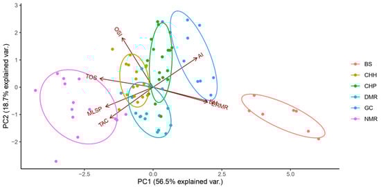 Principal component analysis illustrating the relationships between the total oxidant status (TOS-µmol H2O2 equivalents/L), total antioxidant capacity (TAC-mmol Trolox equivalents/L), oxidative stress index (OSI-arbitrary unit), maximum lifespan potential (MLSP), aridity index (AI), body mass (BM), and estimated resting metabolic rate (ERMR) for captive mole-rat species, namely, the naked mole-rat Heterocephalus glaber (NMR), the Damaraland mole-rat, Fukomys damarensis (DMR), the highveld mole-rat, Cryptomys hottentotus pretoriae (CHP), the common mole-rat, C. h. hottentotus (CHH), the Cape mole-rat, Georychus capensis (GC), and the Cape Dune mole-rat, Bathyergus suillus (BS). PC1 explained 55% of the variance and PC2 explained 20.3% of the variance for a cumulative variance of 75.4%. The direction of the arrows represents the loadings of the variables within a PC.