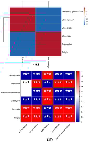 3.6. Correlation between Glucosinolates Identified in Red Cabbage and Broccoli Seeds and Functional Properties