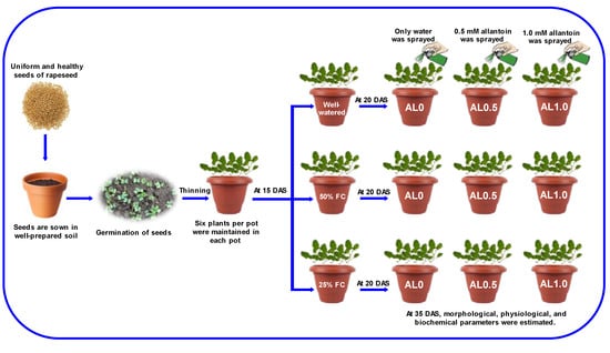 Seeds of Brassica campestris cv. BARI Sarisha-17 were used as the plant material to execute this study. Matured and uniform-sized seeds were sterilized first, then sown in plastic pots (14 L). The seeds of BARI Sarisha-17 were collected from Bangladesh Agricultural Research Institute (BARI), Gazipur, Bangladesh. This experiment was set in a shed house where the average day and night temperature were about 26 ± 5 °C and 17 ± 4 °C, respectively. The relative humidity varied around 53 ± 5%, and the photosynthetic photon flux density (PPFD) was about 800–2300 μmol m–2 s–1. During final soil preparations, BARI [39]-recommended fertilizer doses were incorporated into the soils properly and each pot was filled with 13 kg of soil. The field capacities of two levels of drought, i.e., 50% and 25%, were maintained, and the soil moisture level was measured using a soil moisture meter (Model no: WH0291) from 15 days after sowing (DAS), whereas regular irrigation was performed to the control. The foliar spray of allantoin (C4H6N4O3; FujiFilm Wako Pure Chemical Corporation, Osaka, Japan) was initiated from 20 DAS at 0.5 and 1.0 mM concentrations, which were indicated as AL0.5 and AL1.0, respectively, while only distilled water (dH2O) was sprayed on the AL0-indicated plants at 3-day intervals (Figure 1). In the preliminary trial, it was observed that allantoin concentrations above 1.0 mM had some toxic effects on rapeseed, while concentrations below 0.5 mM did not yield remarkable responses. Although we did not measure the specific concentration of allantoin in the seedlings, previous studies by other authors have indicated an increase in its endogenous concentration in other plants after foliar spray [28,40]. Based on this information, we assumed that applying allantoin at 0.5 and 1.0 mM concentrations would provide sufficient availability for the rapeseed plants. To execute the study, a completely randomized design (CRD) was followed where two sets of pots were maintained, one for growth and yield attributes and another one for physiological and biochemical attributes. Different parameters of morphophysiological and biochemical parameters of rapeseed plants were taken at 35 DAS and harvesting was performed at 90 DAS for measuring the yield attributes.