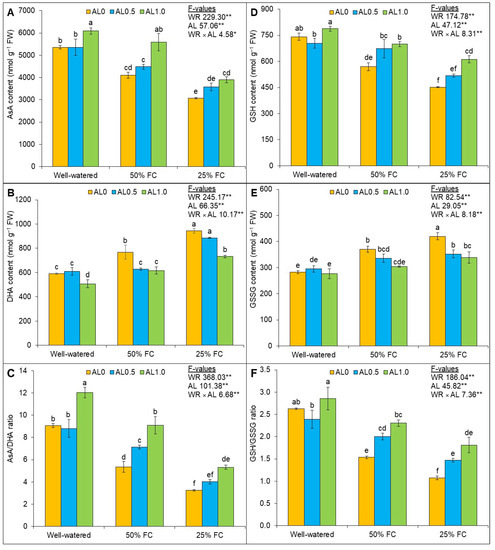 Changes in the (A) ascorbate (AsA) and (B) dehydroascorbate (DHA) contents, (C) AsA/DHA ratio, (D) glutathione (GSH) and (E) glutathione disulfide (GSSG) contents, and (F) GSH/GSSG ratio of rapeseed under drought. Here, AL0, AL0.5, and AL1.0 indicate 0, 0.5, and 1.0 mM allantoin, respectively. Mean (±SD) value calculated from three replications and different letters on each bar indicates significant differences among the treatments at p ≤ 0.05 after applying Tukey’s HSD test. **: p < 0.01, *: p < 0.05, WR: water regime, AL: allantoin.