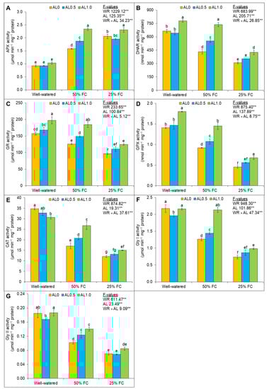 Changes in the activities of (A) ascorbate peroxidase (APX), (B) dehydroascorbate reductase (DHAR), (C) glutathione reductase (GR), (D) glutathione peroxidase (GPX), (E) catalase (CAT), (F) glyoxalase I (Gly I), and (G) glyoxalase II (Gly II) of rapeseed under drought. Here, AL0, AL0.5, and AL1.0 indicate 0, 0.5, and 1.0 mM allantoin, respectively. Mean (±SD) value calculated from three replications and different letters on each bar indicate significant differences among the treatments at p ≤ 0.05 after applying Tukey’s HSD test. **: p < 0.01 WR: water regime, AL: allantoin.