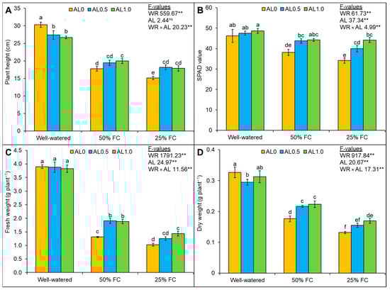 Changes in (A) plant height, (B) SPAD value, (C) fresh weight, and (D) dry weight of rapeseed under drought. Here, AL0, AL0.5, and AL1.0 indicate 0, 0.5, and 1.0 mM allantoin, respectively. Mean (±SD) value calculated from three replications and different letters on each bar indicated significant differences among the treatments at p ≤ 0.05 after applying Tukey’s HSD test. **: p < 0.01, ns: not significant, WR: water regime, AL: allantoin.