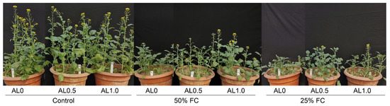 Phenotypic appearance of rapeseed plants under different treatment combinations. Here, AL0, AL0.5, and AL1.0 indicate doses of allantoin at 0, 0.5, and 1.0 mM concentrations that were applied as a foliar spray, and FC denotes field capacity.