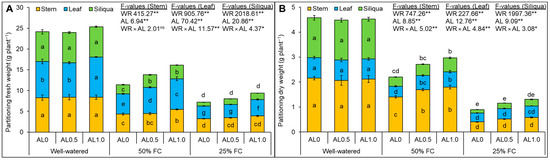 Changes in partitioning, (A) fresh weight and (B) dry weight of rapeseed under drought. Here, AL0, AL0.5, and AL1.0 indicate 0, 0.5, and 1.0 mM allantoin, respectively. Mean (±SD) value calculated from three replications and different letters on each bar indicate significant differences among the treatments at p ≤ 0.05 after applying Tukey’s HSD test. **: p < 0.01, *: p < 0.05, ns: not significant, WR: water regime, AL: allantoin.