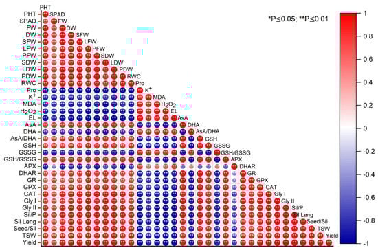 Matrix represents the correlation among the different observed attributes of rapeseed under drought. Here, SPAD: soil and plant analysis development, PHT: plant height, FW: fresh weight, DW: dry weight, SFW: stem fresh weight, LFW: leaf fresh weight, PFW: pod fresh weight, SDW: stem dry weight, LDW: leaf dry weight, PDW: pod dry weight, Pro: proline, K+: potassium ion, MDA: malondialdehyde, EL: electrolyte leakage, H2O2: hydrogen peroxide, AsA: ascorbate, GSH: glutathione, DHA: dehydroascorbate, GSSG: glutathione disulfide, APX: ascorbate peroxidase, GR: glutathione reductase, DHAR: dehydroascorbate reductase, CAT: catalase, GPX: glutathione peroxidase, Gly I: glyoxalase I, Gly II: glyoxalase II, and TSW: thousand-seed weight.