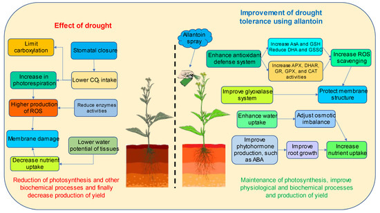 Drought leads to an alteration in the plant–water relationship, causing dehydration due to an increase in water losses from the tissues in plants. This water loss ultimately promotes osmotic stress, suppresses mitotic cell division, inhibits cell enlargement, and reduces photosynthesis in plants [84,85]. Besides this, drought adversely affects stomatal conductance, carbon dioxide diffusion, electron transport, water use efficiency, respiration, transpiration, and membrane function in plants [86]. All of these are involved in the impairment of plant growth and biomass production (both FW and DW). Our findings reveal a notable reduction in plant height, SPAD, FW, and DW upon exposure to drought, which is aligned with the previous reports of Ahmed et al. [57], Wasaya et al. [87], and Mohi-Ud-Din et al. [88]. Under water deficit conditions, nitrogen fixation is restricted due to lower photosynthate supply or reduction in oxygen flux, or lack of deposition of nitrogenous compounds in plants. Hence, the inhibition of nitrogen fixation promotes ureide (allantoin and its hydrolyzed product allantoate) metabolism in various tissues through an allantoate-degrading enzyme, allantoate amidohydrolase (AAH) [74]. AAH converts allantoin to allantoate, and through the hydrolysis of the internal amide bond, allantoate is converted to urea and ureidoglycolate. The further conversion of ureidoglycolate yields glyoxylate and urea. The activity of urease enzymes hydrolyzes urea to produce ammonia and carbon dioxide and supports the growth and development of plants [69,75]. In the present study, exogenous allantoin improved the growth and biomass accumulation of rapeseed plants under drought. Dresler et al. [24] demonstrated that exogenous allantoin improved shoot biomass and photosynthetic (chlorophyll a) accumulation in plants. Allantoin releases more ammonium ions to plants upon complete breakdown [18], and nitrogen (as a micronutrient) is a vital component for proteins, lipids, nucleic acids, certain hormones (i.e., indole-3-acetic acid, cytokinin), and chlorophylls [89]. Moreover, several studies also supported that nitrogen or nitrogenous compounds could mitigate the detrimental effect of stress in different crops [90,91]. In a nutshell, the application of allantoin improved AsA and GSH contents with a concomitant reduction in DHA and GSSG in plants and rejuvenated the ratios of AsA/DHA and GSH/GSSG under drought conditions. Besides this, the activities of antioxidant enzymes such as APX, DHAR, GR, GPX, and CAT, as well as glyoxalase enzymes (Gly I and Gly II), were also increased from allantoin application. Thus, a consequent reduction in H2O2 production and lipid peroxidation was also observed in rapeseed plants. Moreover, allantoin also increased the RWC and reduced proline content in plants under drought, thus ultimately improving the plant growth and yield attributes of rapeseed (Figure 10).