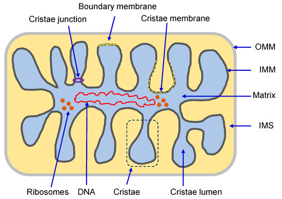 The IMM possesses a significant abundance of proteins with a protein-to-lipid ratio of approximately 80:20. These proteins play crucial roles in various processes, including the ETC, OXPHOS, energy transfer, ion transport, and membrane structural organization. One of the central modulators of cristae curvature is the IMM dynamin-related protein OPA1. OPA1, a fusion GTPase protein, was named after its association with autosomal dominant atrophy, characterized by the degeneration of retinal ganglion cells and optic nerve, leading to gradual vision impairment. OPA1 mediates IMM fusion, a process in which mitochondrial matrix material is exchanged and a singular elongated mitochondrion is generated [44].