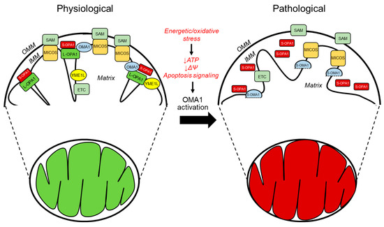 The primary regulators of mitochondrial cristae organization in both physiological and pathological conditions. The diagram depicts the structural arrangement of mitochondrial membranes, in which the cristae arise from the inward folding of the inner membrane towards the matrix. The MICOS complex, which is responsible for organizing mitochondrial contact sites and cristae, is situated at the CJs. It comprises seven subunits, namely, MIC10, MIC13, MIC19, MIC25, MIC26, MIC27, and MIC60. The stabilization of the CJs and establishing contacts between the IMM and OMM requires MICOS to be involved. The convergence of MICOS and the SAM complex results in the formation of a more extensive entity known as the mitochondrial intermembrane space bridging complex, which encompasses the intermembrane space. The protein OPA1 is highly localized at the CJs and its presence is crucial for preserving the proper dimensions of these structures. This necessitates the interplay between the membrane-bound long (L-) variants and the soluble short (S-) variants of OPA1. Under physiological (denoted in green) and pathological (denoted in red) conditions, the IMM proteases YME1L and OMA1 regulate OPA1. The protein OMA1 is responsible for cleaving all isoforms of OPA1 at the S1 site, whereas YME1L is responsible for cleaving OPA1 at the S2 site but only for the subset of OPA1 that contains the splice variant. Under physiological conditions, YME1L modifies the L-OPA1 to S-OPA1 ratio of the heterooligomeric complexes by cleaving a subset of the L-OPA1 isoforms at the S2 cleavage site. Under normal circumstances, OMA1 exhibits minimal activity; however, it is known to become activated in response to pathological conditions. OMA1 cleaves all L-OPA1 isoforms at the S1 cleavage site, releasing S-OPA1 from the IMM and OMA1 self-cleavage resulting in S-OMA1. Additionally, under stress conditions, the SAM-Mic19-Mic-60 axis can be disrupted through the cleavage of Mic19 by OMA1, resulting in the separation of the SAM and MICOS. Overall, the activation of OMA1 under pathological circumstances leads to impaired mitochondrial function.