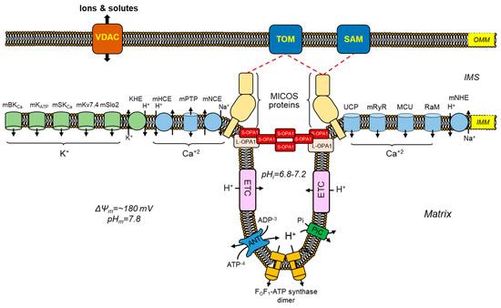 Under physiological conditions, ion transport (i.e., Na+, K+, Mg2+, H+, and Ca2+) through the IMM regulates mitochondrial matrix volume [78,79,80]. Slight changes in matrix volume promote mitochondrial activity and stimulate metabolism. Indeed, increases in matrix volume have been shown to stimulate fatty acid oxidation as well as ETC and OXPHOS. Moreover, mitochondrial swelling induces gluconeogenesis by stimulating pyruvate carboxylase [81,82]. Although the exact mechanisms for these effects of mitochondrial swelling are still being elucidated, IMM structural and functional remodeling could be involved in a response against oxidative stress. Hence, numerous oxidative stress-related human disorders, such as cardiovascular and neurological diseases, are influenced by mitochondrial swelling. Among ions, K+ and Ca2+ have been identified as the primary culprits of mitochondria matrix volume changes [79,83]. To keep in line with this, multiple influx and efflux mechanisms are involved in facilitating the transport of K+ and Ca2+ ions across the IMM (Figure 3). In the following sections, the K+ and Ca2+ transport mechanisms in mitochondria will be discussed. Main modulators of the mitochondrial matrix volume are shown in Table 1.