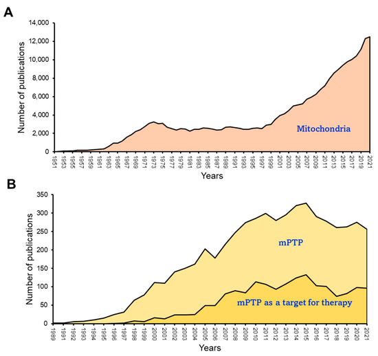 Publication history related to mitochondria and mPTP research. (A) Mitochondrial research conducted over time, indicating a steady increase in the number of studies. (B) A decline of approximately eight years in mPTP research and mPTP-derived therapeutic interventions. The data was obtained from PubMed (https://www.ncbi.nlm.nih.gov (accessed on 5 June 2023)).