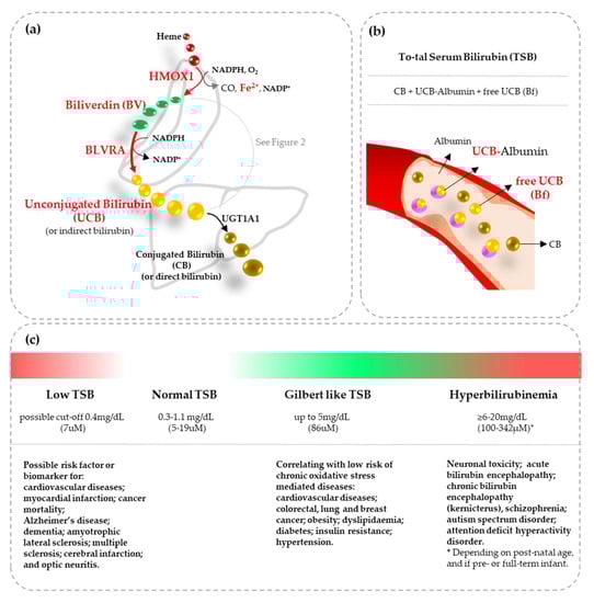 Bilirubin metabolism and clinical correlations among the blood bilirubin level and diseases. (a) Systemic bilirubin metabolism. Heme is oxidized to biliverdin (BV), a hydrophilic molecule, by the action of heme-oxygenase 1 (HMOX1), with the concomitant production of CO and Fe2+. BV is then converted to bilirubin (at this point unconjugated bilirubin—UCB) by the action of biliverdin reductase A (BLVRA). UCB is highly hydrophobic and requires albumin to stay in solution in the blood and reach the liver. The liver is the deputy organ of body bilirubin clearance. In the liver, UCB is bound to glucuronic acid, becoming conjugated bilirubin (CB), by the action of the uridine diphosphate glucuronosyltransferase (UGT) 1A1 enzyme, making back CB hydrophilic, and easily excreted out the body in form of uro- and stercobilinogen. In red the most relevant to the review intermediated/enzymes. (b) The bilirubin species present in blood. Total serum bilirubin (TSB) accounts for UCB bound to albumin (or indirect bilirubin), CB (or direct bilirubin), and a minor part of UCB not bound to albumin (free bilirubin: Bf). Bf is the only circulating bilirubin that can diffuse across cellular bilayers and the blood-brain barrier entering the brain and the cells. When not differently stated, in this paper bilirubin means UCB, and we will focus only on the condition affecting it. (c) A resume of the correlation between TSB and chronic oxidative diseases (for references see text). Notably, the review focus on the changes in TSB due to UCB alterations. Reference on panel (c) “Low TSB”: 9–12, 23, 48, 72, 176; “Gilbert like TSB”: 9–13, 23, 48, 136, 145, 152, 153, 177, 220; and “Hyperbilirubinemia”: 10, 17, 18, 20, 49, 50, 185–189, 193, 196, 197.