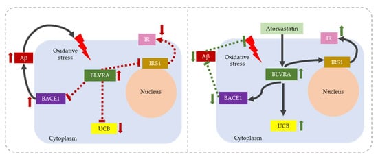 The role of BVRA in BACE-1 mediated insulin resistance in Alzheimer’s disease. Left figure: Oxidative stress promotes BVRA protein modification leading to the increase of its protein level but decreasing its activity including BACE-1 phosphorylation which increases Aβ deposits and UCB production. BVRA impairment also limits IRS1 activation and down-regulates the insulin receptor. Right figures: Atorvastatin target BVRA by restoring its function and mediating the BACE-1 phosphorylation and increasing the production of UCB. Right figure: atorvastatin restores BLVRA function, prevents BACE phosphorylation, decreases Aβ deposits, and up-regulates the IR. Figures are adapted from Triani et al. [69] and Barone et al. [70]. BLVRA: biliverdin reductase A, the adult isoform of the enzyme, BACE1: β-site amyloid precursor protein cleaving enzyme 1, Aβ: amyloid beta, UCB: unconjugated bilirubin IR: insulin receptor, IRS: insulin receptor substrate 1.