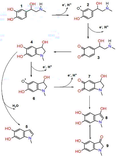 Quinoid oxidation of adrenaline proceeds by a radical mechanism [12,13] through the one-electron reduction of oxygen and the formation of epinephrine semiquinone and epinephrine quinone, followed by a cyclization via the nitrogen atom nucleophilic addition to the aromatic ring, accompanied by the o-quinone group reduction. After that, leukoadrenochrome can be dehydrated to form 5,6-dihydroxy-N-methylindole or undergo further oxidation to form adrenochrome semiquinone and adrenochrome, which can be isomerized to adrenolutin (Figure 1).