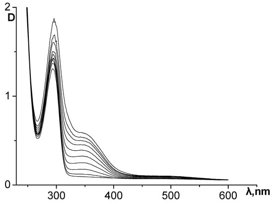 Dynamics of changes in the UV spectrum of the reaction system during epinephrine autoxidation in an alkaline carbonate–hydrocarbonate buffer. The curves were recorded at an interval of 30 s.