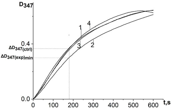 Kinetic curves of absorbance increase at a wavelength of 347 nm of the reaction system of adrenaline autoxidation in an alkaline medium (pH = 10.65) in the presence of chlorogenic acid in various concentrations: 1—control (no chlorogenic acid); 2—1.5 μmol/L; 3—5 μmol/L; 4—37.5 μmol/L. ΔD347(exp)min is the absorbance increase in the reaction system for the first 3 min in the presence of antioxidant at a concentration corresponding to its maximum inhibitory efficiency; ΔD347(ctrl) is the absorbance increase in the reaction system for the first 3 min in the absence of antioxidant. All ΔD347 values were calculated as the difference between the changes in absorbance over the first 3 min of the reaction in experiments carried out in the presence of adrenaline and in its absence (replacing adrenaline with an equal volume of distilled water).