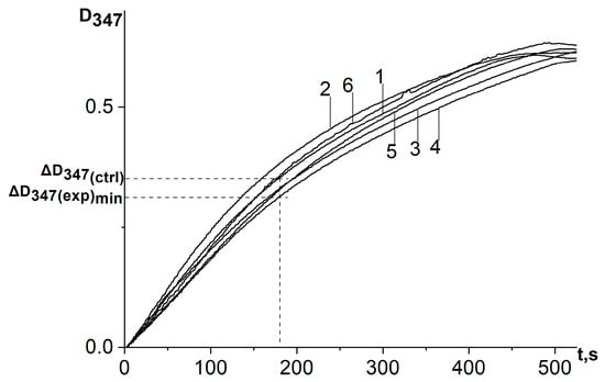 Kinetic curves of absorbance increase in adrenaline autoxidation reaction system in an alkaline medium (pH = 10.65) at a wavelength of 347 nm in the presence of a water–propylene glycol extract of chamomile (Matricaria chamomilla L.) added in different volumes: 1—control (no extract added); curves 2, 3, 4, 5, and 6 are referred to the volumes of 20 μL, 7 μL, 2 μL, 0.66 μL, and 0.23 μL, respectively. ΔD347(exp)min is the absorbance increase in the reaction system for the first 3 min in the presence of antioxidant at a concentration corresponding to its maximum inhibitory efficiency; ΔD347(ctrl) is the absorbance increase in the reaction system for the first 3 min in the absence of antioxidant. All ΔD347 values were calculated as the difference between the changes in absorbance over the first 3 min of the reaction in experiments carried out in the presence of adrenaline and in its absence (replacing adrenaline with an equal volume of distilled water).