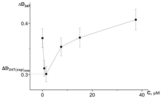 Dependence of the absorbance increase for the first 3 min at a wavelength of 347 nm (ΔD347) in the reaction of adrenaline autoxidation in an alkaline medium (pH = 10.65) on the concentration of chlorogenic acid. ΔD347(exp)min is an increase in the absorbance for the first 3 min at a wavelength of 347 nm in the presence of chlorogenic acid in concentration corresponding to its maximum inhibitory efficiency. All the ΔD347 values were calculated as the difference between the changes in absorbance over the first 3 min of the reaction in experiments carried out in the presence of adrenaline and in its absence (replacing adrenaline with an equal volume of distilled water).