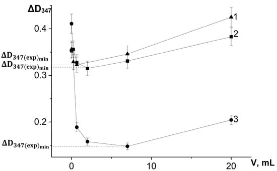 Dependence of the absorbance increase for the first 3 min at a wavelength of 347 nm (ΔD347) in the reaction of adrenaline autoxidation in an alkaline medium (pH = 10.65) on the volume of water-propylene glycol extracts added to the reaction mixture: 1—bur beggar-ticks (Bidens tripartita L.), 2—chamomile (Matricaria chamomilla L.), and 3—yarrow (Achillea millefolium L.). ΔD347(exp)min is an increase in the absorbance for the first 3 min at a wavelength of 347 nm in the presence of chlorogenic acid in concentration corresponding to its maximum inhibitory efficiency. All the ΔD347 values were calculated as the difference between the changes in absorbance over the first 3 min of the reaction in experiments carried out in the presence of adrenaline and in its absence (replacing adrenaline with an equal volume of distilled water).