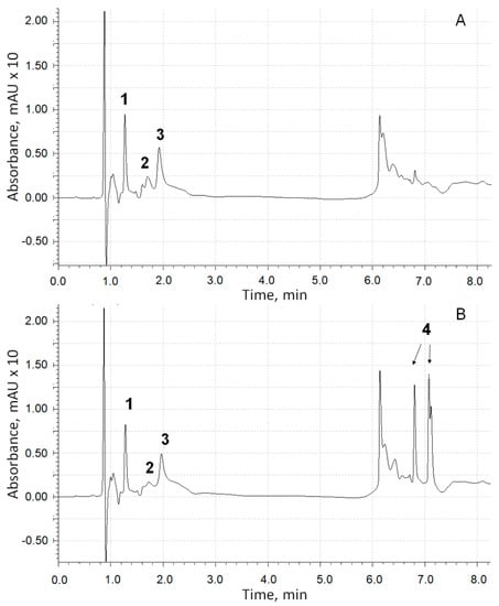 The UV chromatographic profiles at 254 nm of adrenaline autoxidation reaction system without chlorogenic acid addition (A) and in its presence (B): (1)—adrenaline; (2)—adrenochrome; (3)—adrenolutin; (4)—chlorogenic acid (two isomeric forms).