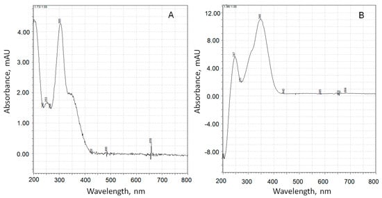 The substance corresponding to chromatographic peak 3 forms a positively charged sodium adduct with m/z = 202.04 and may be referred to adrenolutin, which has a monoisotopic mass of 179.058. Other peaks in the chromatographic profile (Figure 8A) have UV spectra with no pronounced maxima at wavelengths above 250 nm, with the exception of a peak corresponding to a retention time of 1.05 min with a wide maximum at 261 nm in its UV spectrum. Peaks with retention times of 6.14 and 6.23 min are absent in the ionic current chromatographic profile.