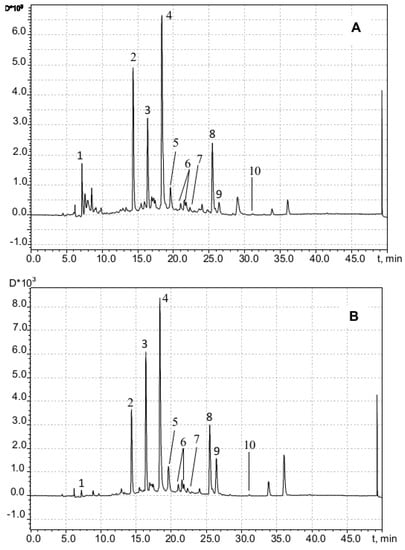 Chromatogram of chamomile flowers extract (water-propylene glycol, 50%) recorded at 254 nm (A) and 330 nm (B): (1) mononuclear phenolic diglycoside (presumably C22H30O12); (2,3) cis and trans isomers, respectively, of 2-glucopyranosyloxy-4-methoxycinnamic acid; (4) apigenin-7-O-glucoside; (5) apigenin-7-O-6-malonyl-glucoside; (6) apigenin-7-O-acetyl-glucoside; (7) acetyl-malonyl-apigenin-7-O-glucoside; (8) apigenin; (9) 7-methoxycoumarin; (10) 5,4′-dioxi-3,6,7,3′-tetramethoxyflavone.