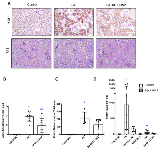 The renal lesions were evaluated using PAS staining, scoring tubular dilatation, loss of/flattened brush border, and cast formation (Figure 1A,B). In the absence of CCN2, tubular damage induced with FA-AKI was slightly milder than in wild-type mice. The kidney damage biomarker KIM-1 was also evaluated. In FA-injected kidneys from wild-type mice, KIM-1 protein levels were markedly upregulated in injured tubules. KIM-1 immunostaining was reduced in CCN2-deficient mice with AKI (Figure 1A,C). Accordingly, in FA-AKI, the kidney gene expression of Havcr1 and Lipocalin 2, encoding KIM-1 and NGAL, respectively, was increased in WT mice, and there was a trend towards milder in CCN2-deficient mice (Figure 1D).