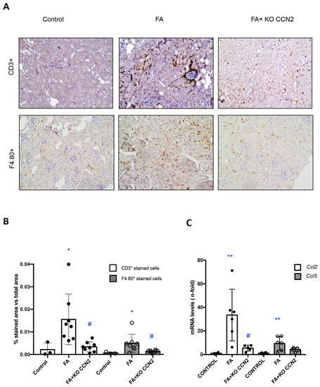 Next, we determined the effect of CCN2 deficiency on the regulation of the inflammatory response in FA-AKI. There was a significant decrease in the number of infiltrating T lymphocytes (CD3+ cells) and macrophages (F4/80+ cells) in the kidneys of CCN2-deficient mice with FA-injected mice compared to wild-type FA mice (Figure 2A,B). The recruitment of inflammatory cells into the kidney is mediated by the local production of proinflammatory mediators. In FA-AKI kidneys, the kidney expression of Ccl-2 and Ccl-5 was upregulated, and there was a trend for lower expression in CCN2-deficient mice (Figure 2C).