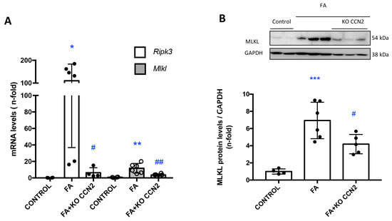 CCN2 deficiency reduced necroptosis-related biomarkers in murine FA-AKI. (A) The kidney gene expression of Ripk-3 and Mlkl was evaluated using RT-PCR. (B) MLKL protein levels were assessed using Western blot. Data are expressed as mean ± SD of 4–8 animals per group. * p < 0.05; ** p < 0.01; *** p < 0.001 vs. control, # p < 0.05; ## p < 0.01 vs. FA.