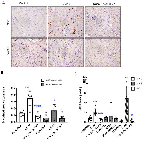 RIPK3 deficiency diminished inflammatory cell infiltration and proinflammatory gene expression in mice following CCN2 administration. Mice were injected with a single intraperitoneal dose of 2.5 ng/g of body weight recombinant CCN2(IV) and studied 24 h later. (A) Representative immunohistochemistry images identifying inflammatory T cell (CD3+) and macrophage (F4/80+) infiltration. Magnification 200×. (B) Immunohistochemistry quantification. (C) Kidney gene expression of Ccl-2 (Mcp-1), Il-6, and Ccl-5 (Rantes) was evaluated using RT-PCR. Data are expressed as mean ± SD of 4–8 animals per group. * p < 0.05; ** p < 0.01; *** p < 0.001 vs. control, # p < 0.05; ## p < 0.01; #### p < 0.0001 vs. CCN2.
