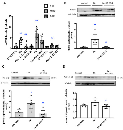 CCN2 deficiency diminished the gene and protein expression of inflammasome components in a murine FA-AKI. (A) Kidney gene expression of Il-1b, Nlrp3, and Il-18 was evaluated using RT-PCR. (B) NLRP3, pro-IL-1β (C), and active IL-1β (D) protein levels were assessed using Western blot. Data are expressed as mean ± SD of 4–8 animals per group. * p < 0.05; ** p < 0.01; vs. control, # p < 0.05; ## p < 0.01 vs. FA.