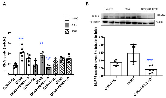 Next, we investigated whether CCN2 activates NLRP3 inflammasome components in the kidney under physiological conditions. In CCN2(IV)-injected mice, several components of the NLRP3 inflammasome pathway, such as NLRP3, IL-18, and IL-1β were upregulated in the kidney, compared to control mice, both at gene (Figure 7A) and protein (Figure 7B) expression levels. RIPK3 can promote cell death and/or inflammation through inflammasome activation [5]. Next, we evaluated the role of RIPK3 in NLRP3 inflammasome regulation. CCN2 administration to RIPK3-deficient mice resulted in the downregulation of kidney NLRP3 gene and protein expression levels and of kidney Il-1β gene expression to control values (Figure 7A).