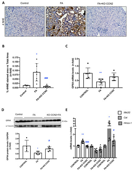 Lipid peroxidation is a process that is present in renal damage impairing nephron function and promoting cell death [48]. To assess lipid peroxidation resulting from oxidative stress, kidney sections were stained for 4HNE. Lipid peroxidation was increased in FA-AKI mice (Figure 8A,B) and decreased in CCN2-deficient FA-AKI mice (Figure 8A,B). Glutathione peroxidase 4 (GPX4) reduces toxic lipid peroxidation. Kidney GPX4 gene and protein expression levels were reduced in FA-AKI mice, and those changes were restored in CCN2-deficient FA-AKI mice (Figure 8C,D). In addition, the regulation of antioxidant components, such as Catalase, and several NRF2-dependent genes, including Hmox-1 by CCN2, was explored. In FA-AKI, increased kidney gene expression of Nrf2 and Hmox-1 as well as reduced levels of Catalase were observed (Figure 8E). CCN2 deficiency restored Nrf2 and Hmox-1 but not Catalase gene expression to control values (Figure 8E).